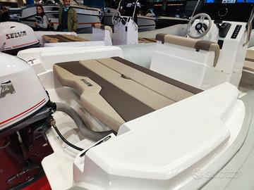 Il comodo sedile di poppa, l'ampio prendisole di prua, gli svariati e capienti gavoni uniti alla generosa struttura in VTR permettono una navigazione ricca di confort ed in totale sicurezza.