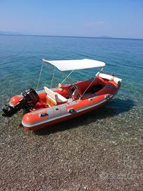 motore 30hp con accensione elettrica ,scaletta di risalita, volante, tendalino, 2 serbatoi, telo di rimessaggio, divanetto 2 posti posizionato su una panca contenitore, telecomando, borse contenitore per gommone chiuso , porta canne da traina, ferramenta completa per assemblaggio . tubolari da 60 divisi in 2 camere per tubolare. Paramezzale in legno, pagliolato in legno.Ancora con relativa cima Ottima tenuta di mare anche con mare formato e con chiglia alta che non fa' entrare spruzzi. portata 5 persone e può portare un motore da 40 hp.