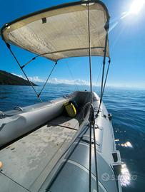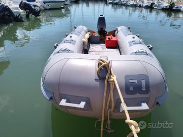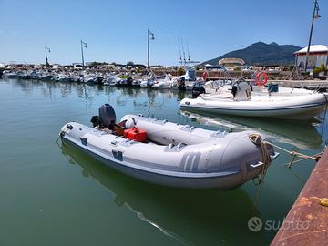 Gommone in neoprene con paramezzale e paiolato in legno, motore Mariner 20 cv, serbatoio, scaletta, remi, tendalino. Tubolari con qualche segno di screpolatura ma integri. Formula visto e piaciuto. Visionabile il fine settimana.