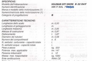 GOMMONE SOLEMAR 22 MOTORE: EVINRUDE 175 MISCELA 2 TEMPI CILINDRATA: 2.590 CC POTENZA FISCALE: 39 CV ANNO 2001 ORE MOTORE: 850 MISURE: ACCESSORI INCLUSI: N.02 SERBATOI CARBURANTE IN ACCIAIO INOX 80 LT DOPPIO TENDALINO COPRISCAFO E ESTIVO TENDA NAUTICA PER PERNOTTAMENTO CUSCINERIA NAUTICA COMPLETA KIT SALVATAGGIO PER 6 PERSONE CIME PER SOLLEVAMENTO GOMMONE COMPLETE DI AGGANCI DOCCIA POSTERIORE CON SERBATOIO D’ACQUA 50 LT ATTACCO IN BANCHINA PER PERNOTTAMENTO CON TRASFORMATORE DA 220 V ANCORA IN ACCIAIO INOX CON CATENA DA 50 MT STAFFA POSTERIORE PER SECONDO MOTORE BAGNO CHIMICO ( NUOVO) ECOSCANDAGLIO GPS N.B. IL MOTORE PIU’ PICCOLO IN FOTO NON E’ INCLUSO