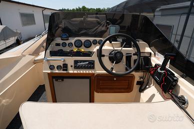 SOLEMAR B22 Offshore (anno 1998) in ottimo stato, sempre tenuto al chiuso compreso motore Mercury 150 EFI e carrello Pedretti biasse 20 qli Lunghezza: 6,40 m - Larghezza: 3,20 m - 12 persone Dotazioni e accessori: Tendalino per campeggio nautico - Cuscineria completa in buono stato Roll-bar - Telo coprigommone - Timoneria Idraulica Salpa ancore con catena da 6 mm – 30 m - Ancora Bruce 7,5 kg Comandi in consolle - 2 Batterie con staccabatteria 2 serbatoi Inox da 110 lt cad. con commutazione in plancia 1 serbatoio acqua da 80 lt con autoclave e doccetta Pompa di sentina - Scaletta di risalita Strumentazione: Ecoscandaglio / Bussola / VHF