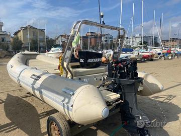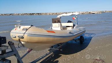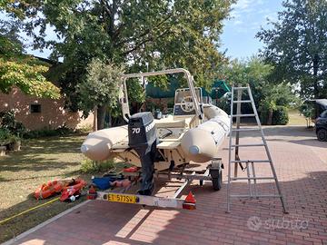 Vendo splendido gommone Solemar E51S Offshore (lunghezza 5,08 mt), perfetto per chi cerca affidabilità, ampi spazi prendisole e versatilità, sia per uscite giornaliere che per il campeggio nautico. Caratteristiche principali e dotazioni: Struttura: Roll-bar abbattibile in acciaio inox con luci di via BRV e segnalatore acustico. Musone di prua in VTR con robuste bitte d'ormeggio. Comfort: Cuscineria prendisole di prua completa e in ottimo stato. Campeggio Nautico: Tendalino parasole completo, ideale per pernottare o proteggersi durante le soste prolungate. Poppa: Comode plancette con scaletta di risalita in acciaio inox e legno. Impiantistica: Serbatoio carburante in acciaio inox, impianto doccia (predisposto con porta doccia), serie di casse in compensato marino. Motorizzazione e Strumentazione: Motore: Evinrude E70TL (2 tempi) da 70 HP – Cilindrata 849 cc. Motore brillante e scattante, con elica in alluminio. Strumentazione di bordo: Quadro completo con contagiri, tachimetro, voltmetro e presa luce 12V. Comunicazione: Predisposizione radio CB con antenna dedicata e altoparlante supplementare. Accessori e Sicurezza inclusi: Ancora con cima. Gonfiatore. n° 5 giubbotti di salvataggio. Carrello Stradale incluso: Modello GEPA CAR GPC 4B. Portata complessiva: 600 kg. Dimensioni: 6,15 mt x 1,925 mt. Rimorchio per uso speciale trasporto attrezzature turistiche e sportive. Prezzo leggermente trattabile dopo visione Ho il certificato di potenza del motore e il libretto del carrello in regola per il passaggio di proprietà