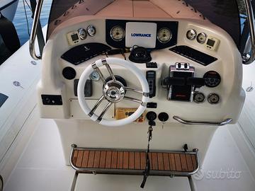 Natante Stilmar 34 anno. 2004. 2 x Mercruiser 6.2 MPI. Plancetta maggiorata con teak massello Nuovo, Tappezzeria completa Nuova, Tendalini nuovi, ancora in acciaio inox Nuova, WC Nuovo, Salpa ancora con conta catena senza fili Nuovo, Faretti sopra e sotto plancetta, impianto stereo nuovo, tubolari tessuto ORCA White, teak interno nuovo, motori completamente revisionati e controllati con utilizzo ricambi originali Mercruiser, ROSER NUOVI, vano motori con apertura automatica, Scaletta di risalita acciaio inox Trem Nuova, volante nuovo, 2 docce, tavolo a Prua. Lavello e rubinetteria nuovi, pozzetto freezer, faro notturno orientabile elettricamente. ACCETTASI PERMUTA Tel. 3284338275