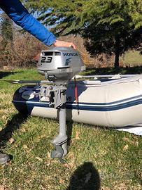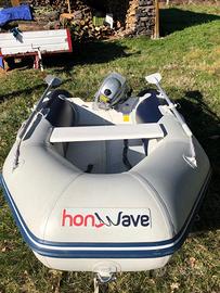 Vendo package Honda Marine composto da gommone tender Honwave T24-IE e motore Honda 2.3CV (1.7kW). Modello con il fondo gonfiabile ad alta pressione (V-Floor) Specifiche Tecniche Gommone (Modello T24) * Lunghezza: 2.40 metri * Portata: 3 persone / 400 Kg totali * Peso contenuto: Facilmente trasportabile da una sola persona. Motore: Modello: Honda BF 2.3 Inclusi nel prezzo: remi originali, panca, sacca di trasporto e kit di gonfiaggio.