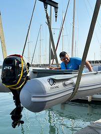 Gommone Zodiac 360 anno 2024 chiglia rigida in alluminio (molto piú leggero rispetto allo scafo in VTR), usato come tender per 2 stagioni e sempre rimessato al coperto. Motore Suzuki 20 gambo corto anno 2023 con 20 ore di moto. Condizioni pari al nuovo.