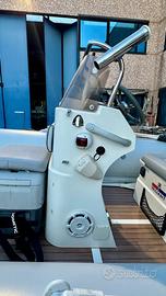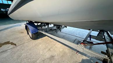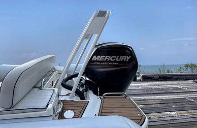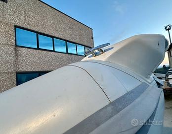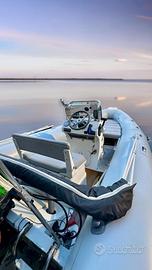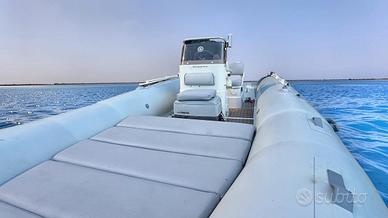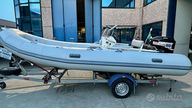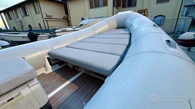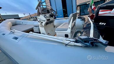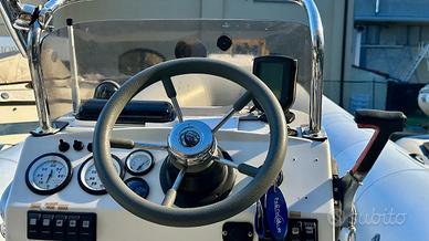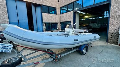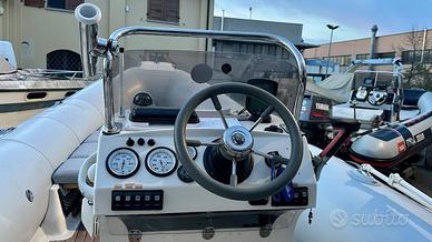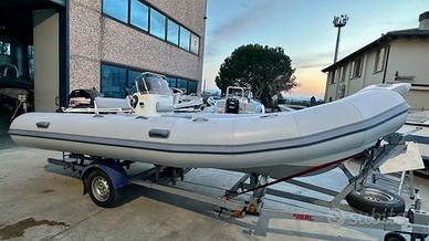 Bellissimo gommone usato con chiglia in vetroresina Valiant 570, tubolari rifatti di recente perfetti, motorizzato con un Mercuri 115 HP elettrico (anno 2006) con sole 640 ore di moto. Velocità massima 36 nodi, velocità di crociera 25 nodi. Il gommone ha una lunghezza di 570cm per 240 cm di larghezza e ha una portata massima di 15 persone. È dotato di rollbar, timoneria idraulica, strumentazione tra cui contagiri, livello benzina, spia olio, temperatura, ricarica batteria, livello trim, Ecoscandaglio, LOG, bussola, musone di prua in vtr, serbatoio benzina, serbatoio acqua, doccetta esterna, autoclave, pompa di sentina, due plancette di poppa, scaletta risalita bagno, Batteria, Imianto batteria 12 V, Cuscinerie prendisole di prua, Cuscinerie di poppa, piano di calpestio in CER/DECK, tendalino pozzetto, telo copriscafo. Disponibile a richiesta anche con carrello già settato per questo gommone a prezzo supercompetitivo.
