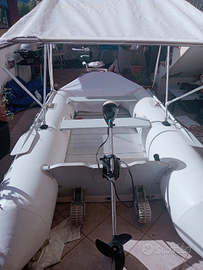 4 metri di lunghezza fondo rigido smontabile, tendalino para sole, telo copri punta, motore elettrico 54lb, batteria (non presente in foto) 105ah nuova usata meno di un anno, ruote di alesaggio.
