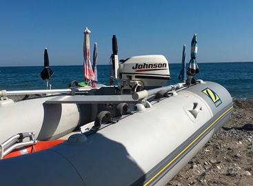 Gommone con chiglia gonfiabile. Completo di giubbetti salvataggio, salvagente, ruote, scaletta, remi e altri accessori. Facile da trasportare in auto una volta sgonfiato. Tubolari con tenuta perfetta. Serve solo una minima riparazione di incollaggio dello specchio di poppa.