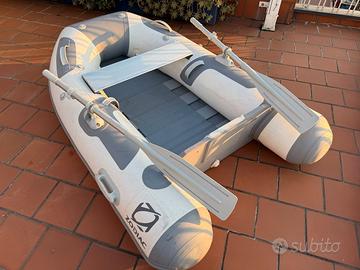 Dimensioni: 200x130 cm. Completo di remi, panchetta e pompa. Pagliolato provvisto di stecche di irrigidimento. Robusto e leggero