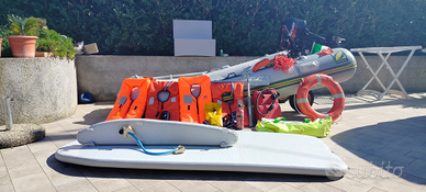 Vendo per passaggio a più grande, gommone zodiak da 3, 1 0 MT completo di tutto,borsone d'obbligo contenente "4 giubbotti , estintore ancora imballato,corda galleggiante,mezzo marinaio,corda 25 MT. Con ancora a 4 ,sessola manuale,remi,gonfiatore a pedale copri gommone, bandiera omologata e ruote di alaggio,sacca sotto mensola originale zodiak.Ghiglia completamente pneumatica con pinna centrale, più motore Mercury 10 HP già rimessato ed ingrassato. Il gommone come da foto ha piccola scollatura ma non bucato (riparazione fatta con colla sbagliata ma risolvibile con poco) come da foto. Il gommone si monta in 15 minuti e viceversa molto comodo si può trasportare in auto. Prezzo discutibile.