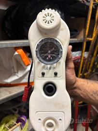 Questo gonfiatore è provvisto di un manometro per la selezione della pressione desiderata, arrestandosi automaticamente al raggiungimento della stessa.