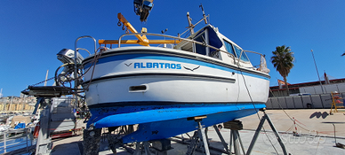 In cabina a prua piccolo letto matrimoniale con annessa illuminazione, locale utilizzato come deposito materiali e dotazioni con annessa illuminazione wc chimico mai usato, giardinetto esterno pieghevole con annessa scaletta retraibile, timoneria idraulica con bypass per poter guidare anche a barra esterna, doppi comandi esterni, a sinistra centro barca letto singolo trasformabile due posti con tavolino, vari scomparti antivegetativa fatta a giugno con annessi zinchi su elica e timone sostituite le boccole della radice in delrig per asse timone.