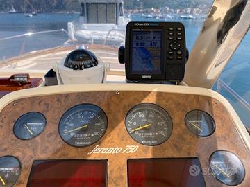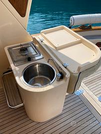 Accessori: salpa ancora elettrico con comando sia da plancia che da remoto, navigatore GPS Garmin, doccino esterno, spiaggetta di poppa con scaletta integrata, lavello e fornello a gas (bombola inclusa), frigorifero, bagno con lavello e WC con scarico diretto a mare, cuscineria interna ed esterna completa, n°7 parabordi completi di copriparabordo in tessuto blu, n°2 tendalini in pvc (copertura tuga e di poppa), n°2 pompe di sentina, n°3 batterie acquistate giugno 2024, manuali tecnici di ogni cosa completi ed integri.