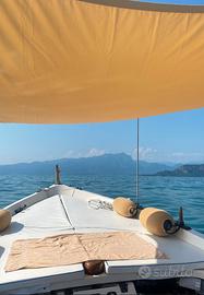 Gozzo cantiere Gobbi 6,5 mt, scafo (6,5x2,3 mt) vetroresina autosvuotante, condizioni eccellenti. SOLO E SEMPRE LAGO di Garda, dimostrabile con pagamenti posto barca. Cuscineria totale in pelle nautica nuova, moquette antiscivolo, doccetta nuova da 50l. Tutte le dotazioni di sicurezza nuove, luci di via, bussola, tromba, 8 salvagenti, 1 anulare, estintore, razzi etc… Motore Volvo Penta diesel (no patente), pochissime ore, appena revisionato e tagliandato. Consumi nulli (circa 1,5 lt/h a 7 nodi). Serbatoio carburante inox 40l. Batteria nuova Impianto stereo hi-fi Alpine da 500w, presa 12v Tutti i dettagli, timone (nuovo in inox), remi, gavoni, prua, scaletta, bandiera, sono in mogano massiccio intarsiato. Scafo appena lucidato e antivegetativa nuova. Tendalino nuovo in inox, parabordi con copri in spugna, cime in treccia nuove, ancora etc. Telo di copertura robusto su misura, struttura in inox. Pronta in ogni dettaglio per la stagione! Barca visibile a Lazise per qualsiasi prova Prezzo trattabile Possibilità di trasporto Per info 3925345170 Filippo Non scambio con gommone, moto d’acqua, motoscafo o altro