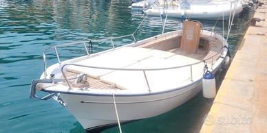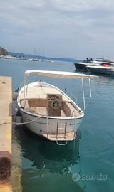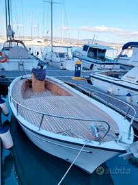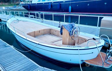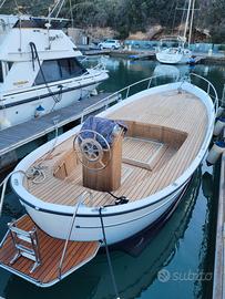 Gozzo Bani 8 metri in ottime condizioni, scafo semiplanante. Coperta totalmente rivestita in teak, scafo in vetroresina, gelcoat verniciatura totale due anni fa, spiaggetta di poppa con scaletta inox, colonnina timoneria con strumentazione a poppa, timone a ruota con idroguida, impianto elettrico con due batterie totalmente rifatto due anni fa, impianto stereo marino due altoparlanti, piano calpestio con illuminazione notturna, grande gavone sotto la tuga con cuscineria intera nuova, luce e ripiani laterali, cuscineria esterna su tutta la tuga, verricello elettrico con catena con comandi a prua ed anche su colonnina timoniere, due tendalini, serbatoio acqua dolce con autoclave e doccetta a poppa.