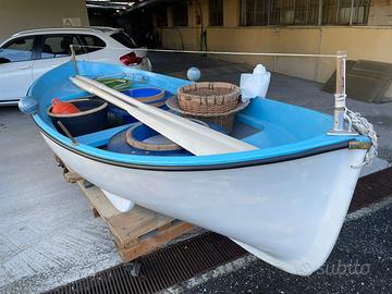 Gozzo in ottima vetroresina in perfette condizioni di mantenimento completo di remi e carrello in foto. Dimensioni 3.6x1.45 metri. Predisposto per motore entro e fuoribordo non inclusi. Attrezzatura da pesca non inclusa.