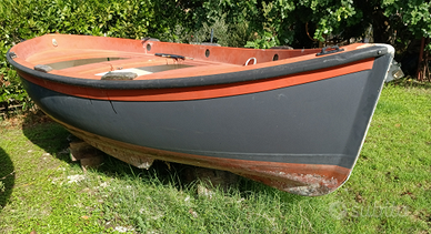 Gozzo in vetroresina con scalmi e remi, dotato di supporto in acciaio per fuoribordo