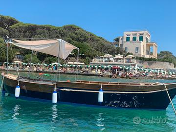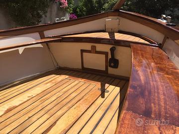 Gozzo di legno 6,60m largo 2,10m con coperta in iroko e mogano. Tendalino nuovo e copertura nuova su misura. Remi in mogano e iroko, scaletta in mogano. Motore entrobordo Volvo penta MD11C. Tagliandato e revisionato. Resinata interamente con West System. Visibile alla boa a Castiglioncello.