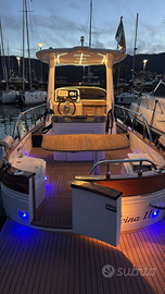 Motorizzato yanmar 230 t.d. ore di moto, 300 ...una sola stagione in mare, perfetto gozzo planante WA, T-Top bianco, Manutenzione e tagliandi regolari con ancora un anno di garanzia ufficiale del fabbricante. Allestimento, super accessoriato: T-Top, inverter, elica di prua, cucina a induzione, frigo, lavandino, cuscineria completa trasformabile, cabina con letto matrimoniale, wc separato con porta, doccia, stereo, flaps elettronici, cuscineria pelle color beige. Luci calde led cortesia esterne e interne Display digitale 9 pollici, ecoscandaglio Garmin, tavolo pranzo apribile, tenda con pali in carbonio, Teak ultima generazione sintetico anti invecchiamento Portata: 8 pax Velocità max: 26 nodi Vendesi per passaggio a categoria superiore.