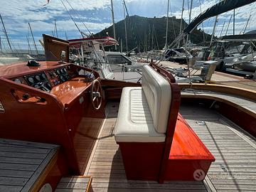 verricello elettrico, tendalino, bussola, wc elettrico, frigo, parabordi con copriparabordi, piattaforma bagno con scaletta, tavolo per pozzetto, panca contenitore in pozzetto fatta su misura, copertura cuscini esterni spugna blu .