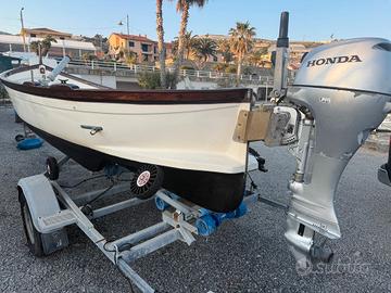 Gozzo Sciallino pontato in vetro resina mt 5 con motore Honda 10 cv fuoribordo con accensione elettronica a batteria, due grossi gavoni. Legni trattati, fatta antivegetativa, motore tagliandato, pronto per andare in acqua.