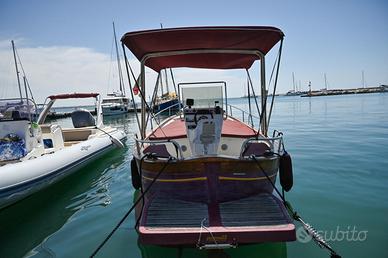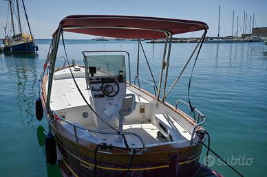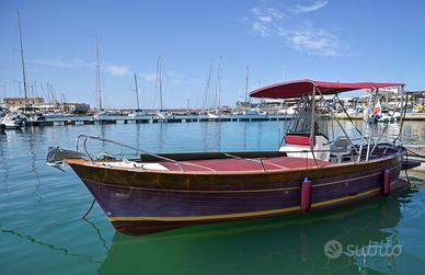 Gozzo Sorrentino planante, lunghezza 7,60 FT, motore entrobordo ATM diesel 100 cv, scafo in vetroresina pontato in iroko e mogano, completamente equipaggiato, consolle e sedile guida, verricello elettrico salpa ancore, ancora acciaio inox catena 20 mt, elica di prua, impianto doccia, plancetta di poppa con scala risalita estraibile, tendalino zona guida, poppa e prolunghe complete prua, bitte e passacavi, chiusure portelli, insonorizzazione vano motore, 2 batterie, stacca batteria, n. 2 pompe sentina, luci di vie e di fonda, Voltometro, Contagiri, spie pressione olio, serbatoio gasolio con indicatore livello, scatola comandi mono leva, Ecoscandaglio.