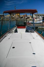 Sullo scafo: sverniciatura parti in legno e verniciatura totale con coppale golden Fishing della Cecchi capo di banda e battagliole in legno, pulizia e ciclo di verniciatura in carena. Cuscineria completa e tendalini aggiuntivi su misura, cuscino poggia schiena.