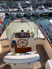 falchetta e capobanda in mogano, completo di cuscineria, roll bar in acciaio con doppio tendalino , verricello elettrico con catena da 50 mt, elica di prua, doppia batteria con selettore stacca batteria, doccia esterna, cabina con 2 posti letto e wc a pompa.