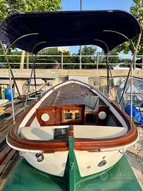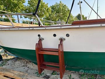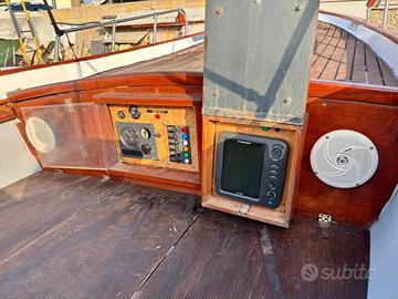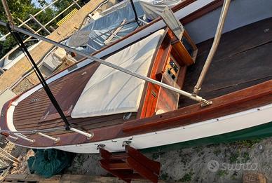 Gozzo vetroresina pontato mogano Lunghezza : Mt 5,25 Larghezza baglio : Mt 1,98 Motore : Vetus Mod. 328 30CV entrobordo diesel Accessori: -Motore elettrico per varo ed alaggio -Tendalino 4 archi acciaio inox -Cuscineria poppa e prua -Ecoscandaglio FURUNO Mod 585 pigna bronzo -600W -Dotazione minima per le tre miglia. -Scaletta in mogano laterale -Casse bluetooth tel. 348 6565203