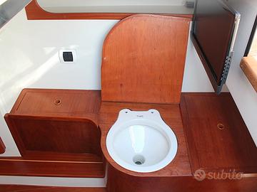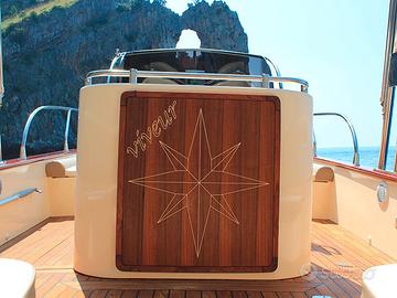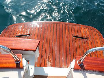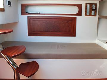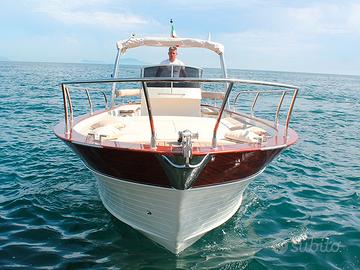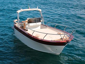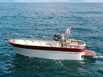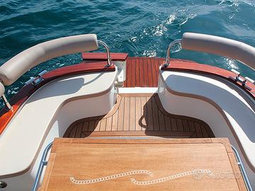 Disegnato sullo stile classico, costruito con cura artigianale e con le piú moderne tecniche di costruzione. Gli interni sono ideati per offrire versatilitá e vivibilitá. L'ampio prendisole a prua copre una spaziosa cabina dotata di un letto matrimoniale e un divano letto (che offrono complessivamente tre posti letto), diversi vani portaoggetti e un wc. L'ampia timoneria centrale assicura la massima visibilitá e manovrabilitá e dispone di una strumentazioni di bordo completa ed efficiente. Il comodo sedile di guida nasconde una cucina dotata di fornello a due fuochi, un lavabo e un tavolo apribile. La classica poppa arrotondata del gozzo ospita una pratica pedana in legno con una solida scaletta in acciaio.