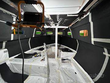 Interni: tutti i legni (multistrato Okumé) sverniciati, carteggiati e ridipinti con pitture specifiche. Moquette interna nautica nuova.
