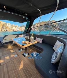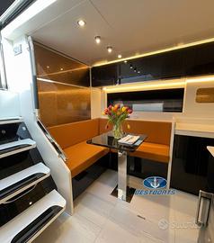 Imbarcazione sportiva in linea d'asse con un'ampia cabina di poppa sotto al prendisole con seconda cucina dedicata.