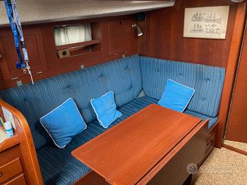 Cabina di prua con due cuccette, Toilette con wc marino, lavandino e pavimento come cabina doccia con griglia in teak su una parete drenante; Salone con divano a L a sx e dritto a dx convertibili in cuccette e grande tavolo con ali pieghevoli. Cucina a L con piano cottura a gas 2 fuochi e forno, ghiacciaia 80lt, doppio lavello inox con pompa acqua dolce. Tavolo carteggio sul lato opposto, Banco di lavoro nel passaggio verso la cabina di poppa. Cabina di poppa con due cuccette.