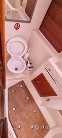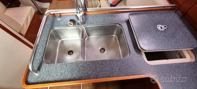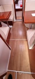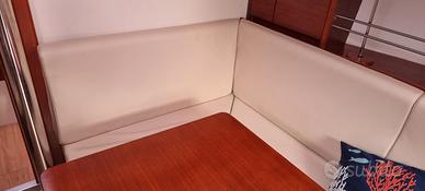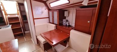 Cucina a L a tribordo, dinette abbattibile a centro barca, a babordo tavolo carteggio a murata con due sedute.