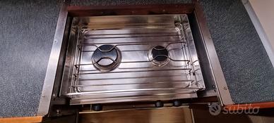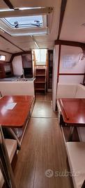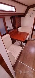 Cucina a L a tribordo, dinette abbattibile a centro barca, a babordo tavolo carteggio a murata con due sedute.