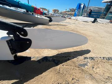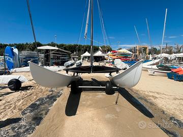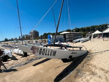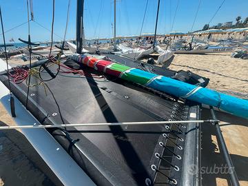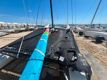 Timoni race nuovissimi , telo mesch nuovo , scotta randa nuova , vele campionato europeo 2023 con relative stecche usate pochissimo. Carrello big foot , telo copri trampolino , copri timoni
