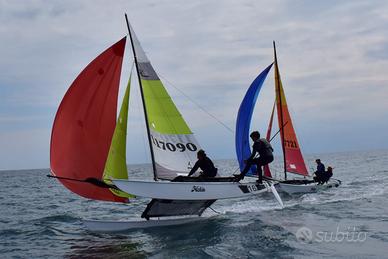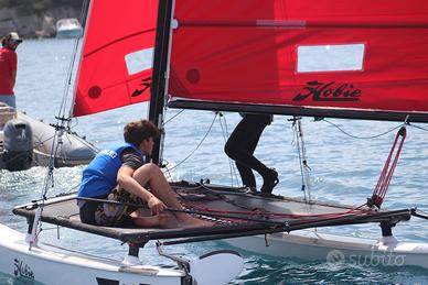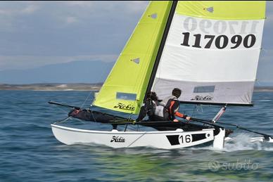 Vendo hobie cat 16 race pronto per regatare. La barca sarà disponibile dopo i campionati giovanili in doppio a fine agosto. La barca è visibile alla compagnia della vela di Roma (lago di Bracciano). È del 2017, è stata usata i primi due anni poi è stata smontata ed è rimasta ferma fino al 2021 anno da cui la utilizzo. Vendo a malincuore per l'inizio dell'università. La barca è la versione race (con pale in carbonio modello EPO 3) e inoltre presenta le seguenti modifiche: - Trapezi in dynema con altezza regolabile - Circuito trapezi con ascensori sia al prodiere che al timoniere - Drizza fiocco rastremata - Baffetti del bompresso in dynema regolabili - Copripale e Telo copribarca - Stick in carbonio telescopico In vista dell'europeo 2025 sono stati sostituiti - Sartie, stralletti e strallo - Carrello randa - Tutti i pezzi del meccanismo di incastro delle pale del timone Negli anni - Trampolino forward (2023) - Traversa anteriore sostituita (2023) - Neoprene delle traverse laterali nuovo (2024) Il prezzo è per la barca Classic (senza kit spi) con vele originali della barca, numero velico 117090, ancora buone per navigare e per allenarsi. Valuto offerte per la vendita aggiuntiva (non separatamente) del kit spi e delle vele 119051 (vele con i colori dell'europeo 2024, ma mai usate al campionato in quanto erano di riserva). Sono state usate per 10 giorni di acqua nel 2024 e nel 2025 da fine marzo ad oggi per regate e allenamenti. Per quanto riguarda il kit spi la barca ha 3 gennaker, uno da allenamento rosso, uno in buone condizioni e molto magro ottimo per regate o allenamenti in giornate ventose e uno da regata rosso utilizzato per circa 25 giornate di regata. La barca è ancora al massimo delle sue prestazioni, ha vinto il campionato italiano assoluto 2024, il campionato europeo youth 2025 inoltre agli ultimi due europei open (2024 e 2025) si è piazzata rispettivamente nona e ottava in gold fleet.