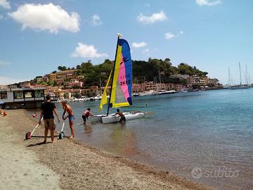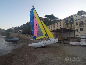 Catamarano Hobie wave 4 metri X2 metri perfettamente funzionante come da foto, completo di randa, fiocco scotte e ferramenta. Vendo smontato, ritiro di persona a vostro carico. Porto Azzurro isola d'Elba (LI)