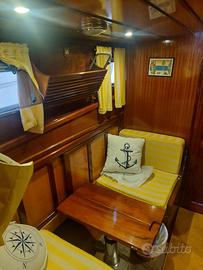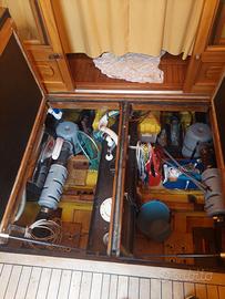 Pilotina 33 non immatricolata, anno di costruzione 1971,dislocamento 7000 Kg. pescaggio 0.97, motori 2 Vetus 80 cv 4 cilindri,trasmissione linea asse, governo motori con telecomando, sebatoio Gasolio 300 litri, serbatoio acqua 150 litri, serbatoio acque nere 100 litri, impianto idraulico con ingresso acqua dolce con pompa elettrica, doccia esterna, Wc elettrico, 3 pompe di sentina automatiche emanuali, impianto elettrico 220v e 12v. Webasto, carica batterie, allarme motore, bussola fischinder navigatore , VHF, salpa ancora elettrico con 50 metri di catena, frigo 12v 220v, luci regolamentari, ampia dinette con tavolo in legno,trasformabile in letto.Lavandino con rubinetto flessibile, una cabina armatoriale a prua, armadio cabina, tendalino estivo a prua, cuscineria completa,portacanne, manutenzione annuale motori e carena, boiler acqua calda copertura estiva e invernale.
