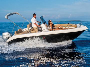Barca molto spaziosa per la sua categoria, lunga 5,70 mt., prendisole con tavolo e seduta fronte consolle di guida.