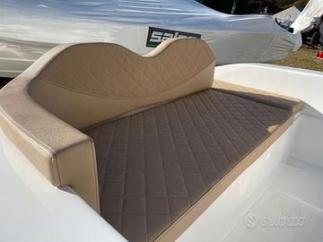 Cuscineria e fascia laterale personalizzabile senza sovrapprezzo, tasche laterali e già pronta navigare con serbatoio da 70 litri e impianto elettrico oltre a luci, sentina, scaletta bagno.