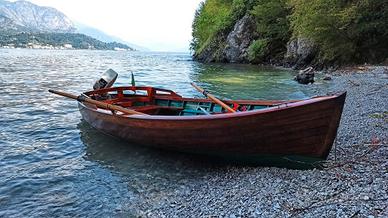 Barca tutta in legno perfettamente conservata. Sempre in darsena. Completa di sedute, copribarca, remi e motore Johnson 4 KW