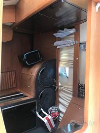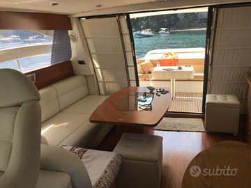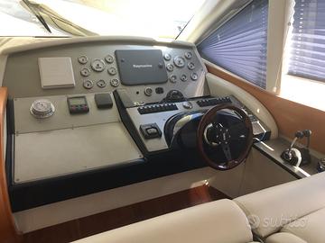 Di fronte al divano troviamo un mobile completo di cassettiera dove è fissato il TV. Dirigendosi verso prua si arriva, a destra nella postazione di comando, arredata con due sedili, sempre rifiniti in pelle, manovrabili in altezza elettricamente e manualmente avanti e indietro, al fine di rendere più agevole e funzionale possibile sia la visuale attraverso l'ampio parabrezza, sia le manovre di guida, supportate anche dalla presenza di una completa strumentazione di bordo.