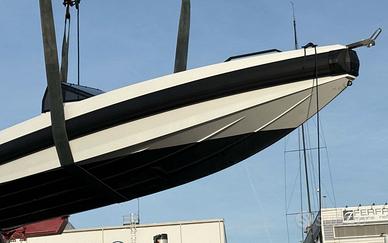 LA CONFIGURAZIONE PROPOSTA INCLUDE: Natante con la sua carena filante che garantisce performance eccellenti, bottazzo integrato strutturale e antivibrante, motore Mercury 400Verado con comando elettronico, supporto per traino sciatori, elica di prua, salpa ancora con comando in console, sistema in recesso nel gavone di prua, Wc chimico inserito sottocoperta in gavone dedicato, cuscineria del prendisole a prua completa di prolunga per ampliamento, cuscineria del sedile davanti alla console di guida, doppio divano nel pozzetto di poppa con 5 posti e tavolino abbattibile, frigorifero a cassettone in pozzetto, sistema di navigazione integrato Simrad 12'', due sedili abbattibili in console posto guida.