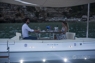 Isola barca e piattaforma galleggiante Si tratta di una struttura galleggiante, progettata e realizzata in vetroresina, che può essere utilizzata per relax, eventi e come estensione di complessi ricettivi uso privato con motore elettrico per il posizionamento e navigazione