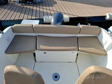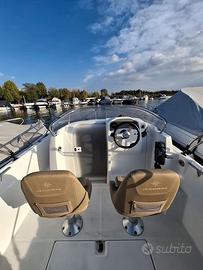 Barca walkaround ideale sia per le gite in famiglia che il campeggio nautico grazie alla sua cabina 2 posti completamente cuscinata, grande prendisole di prua e comodo pozzetto con tavolo pic-nic, accessoriata di ogni comfort per trascorrere piacevoli giornate a bordo.