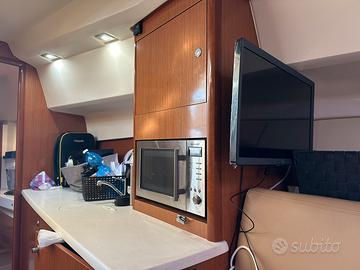 Quattro posti letto comodi con locale toilette separato, ampi gavoni ed armadi per stoccaggio, materiale ed abbigliamento; divano di poppa ad U trasformabile in ampio prendisole matrimoniale; elettronica di bordo aggiornata.
