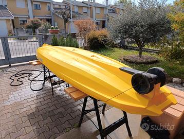 Vendo Kayak-Canoa biposto da pesca - Mojito Fishing Big mama kayak - kayak 380 cm - 2 posti adulto + 1 posto bambino + 2 gavoni + 2 ruote integrate + 2 pagaie + 2 seggiolini + 4 portacanne – GIALLO.