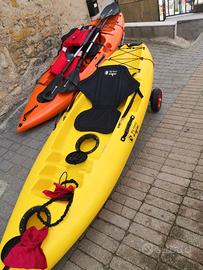 2 canoe Big Mama mod. OLA complete di pagaie, sacche gavoni stagni, seggiolini con schienale specifici, lacci per pagaia e giubbini galleggianti Tribord, carrellini dedicati per agevole trasporto da e per la spiaggia.