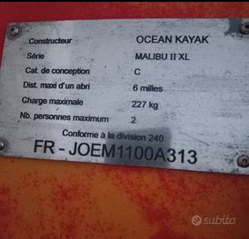 Bellissimo Kayak oceanico biposto di fabbricazione neozelandese usato pochissimo e rimesso al chiuso in garage. Ottimo per la famiglia e per la pesca. Possibilità uso singolo spostando un seggiolino al centro. Molto stabile e veloce. Due seggiolini originali molto confortevoli e regolabili, due pagaie, maniglie integrate, due portacanna fissi ad incasso, due basi/adattatori scotty 241 sia per reggicanna che per altri accessori, completo di 3 gavoni, con gavone centrale molto capiente anche per batteria per ecoscandaglio/motore elettrico, fori di svuotamento, carrello di trasporto BIC con ruote comprensivo di custodia. prezzo trattabile